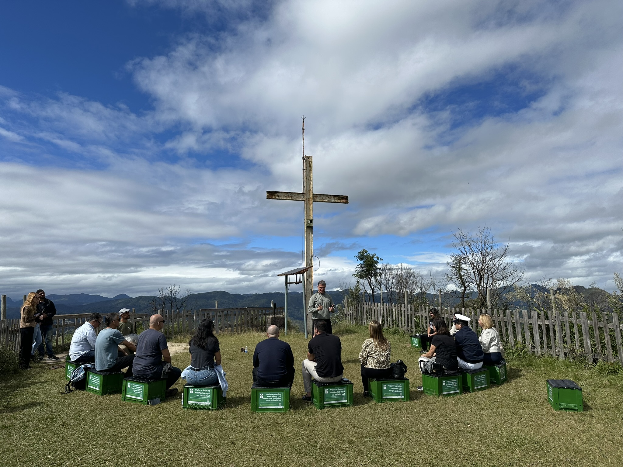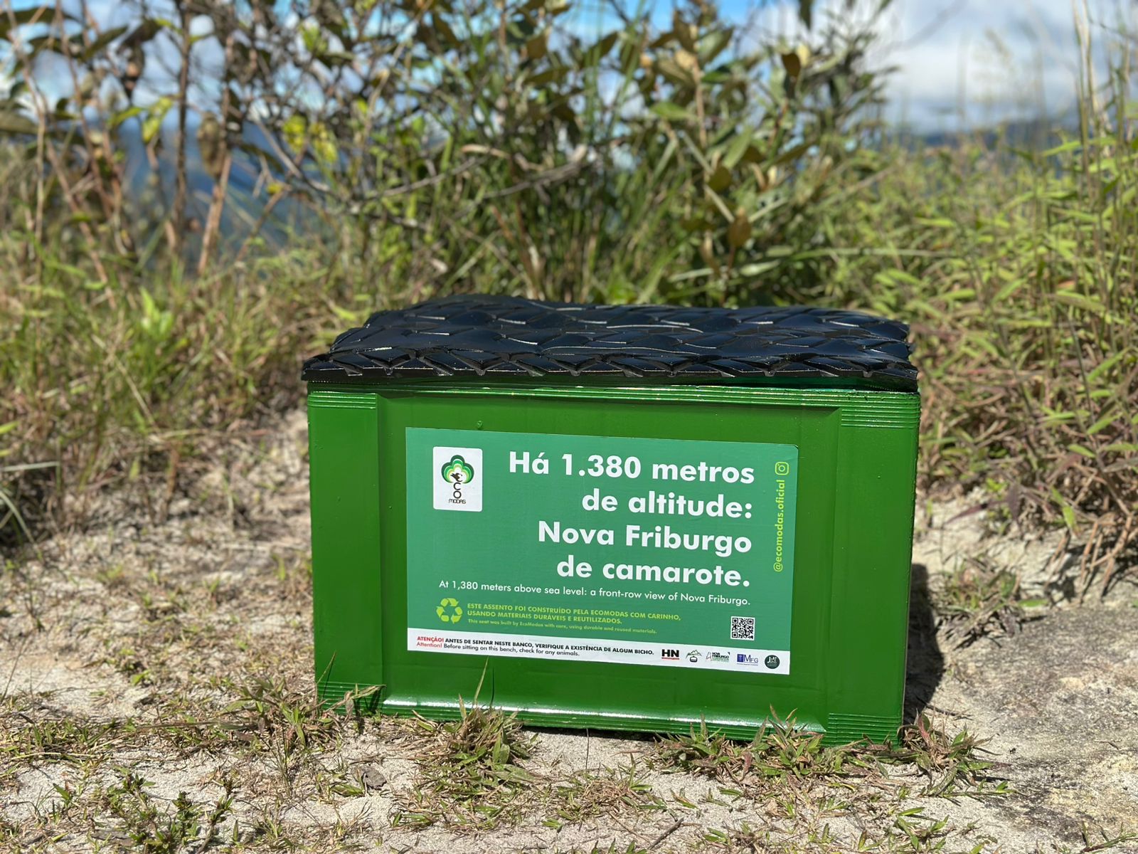 Esta instalação sustentável da EcoModas contou com o apoio da Hn Comunicação Visual, Ju Cheles, MFG Contabilidade, Convention Bureau de Nova Friburgo e Centro de Lazer do Teleférico, e foi oficialmente apresentada à cidade como "um presente para Nova Friburgo", antecedendo as comemorações do aniversário do município, celebrado em 16 de maio. No momento de inauguração, estiveram presentes alguns representantes do setor de turismo, meio ambiente, Marinha do Brasil, OAB-RJ, TV Cidade, TV Zoom, InovaFri Valley e outros. A manhã deste dia foi marcada também por uma experiência sensorial única, que convidou os participantes à contemplação não apenas da natureza, mas também de si mesmos. Envolvidos pelo som suave do handpan, conduzido por Ricardo Vasconcelos, da Medicina do Som, os presentes vivenciaram um momento de introspecção a 1.380 metros de altitude. A atividade contou ainda com a participação do professor de yoga Henrique Moraes, que guiou o grupo em práticas respiratórias leves, promovendo conexão, presença e bem-estar. Como gesto simbólico, uma muda de Quaresmeira foi plantada no Morro da Cruz pela secretária do Meio Ambiente, Andréa Duque, em conjunto com Adriana Santos, bióloga e sócia fundadora da EcoModas, reforçando o compromisso com o cuidado com a natureza.