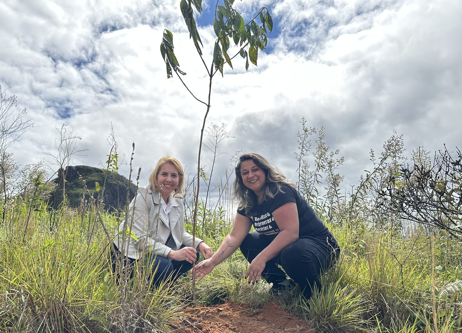 Adriana Santos, sócia-fundadora da EcoModas, ao lado de Andrea Duque, secretária de meio ambiente de Nova Friburgo, plantando uma muda de quaresmeira.