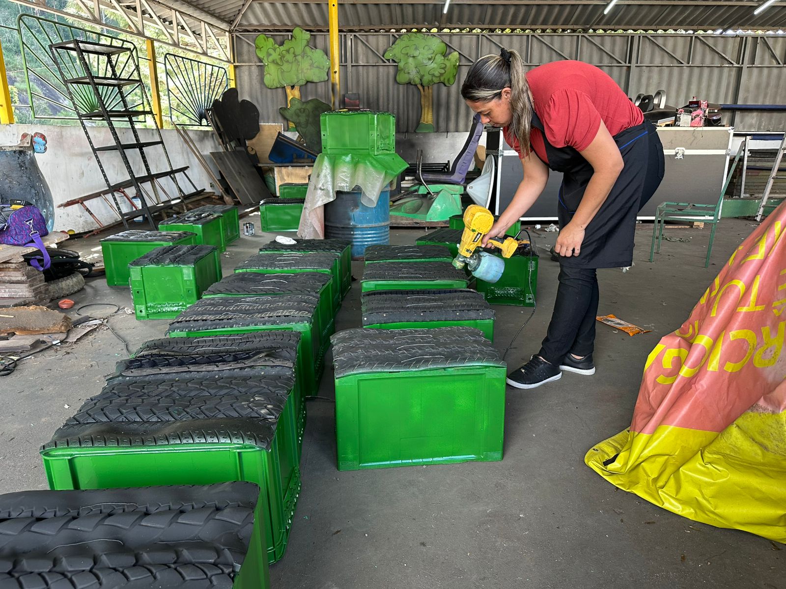 Feitas com reaproveitamento de garrafeiras plásticas e pneus, os bancos foram pensados para serem resistentes e confortáveis.