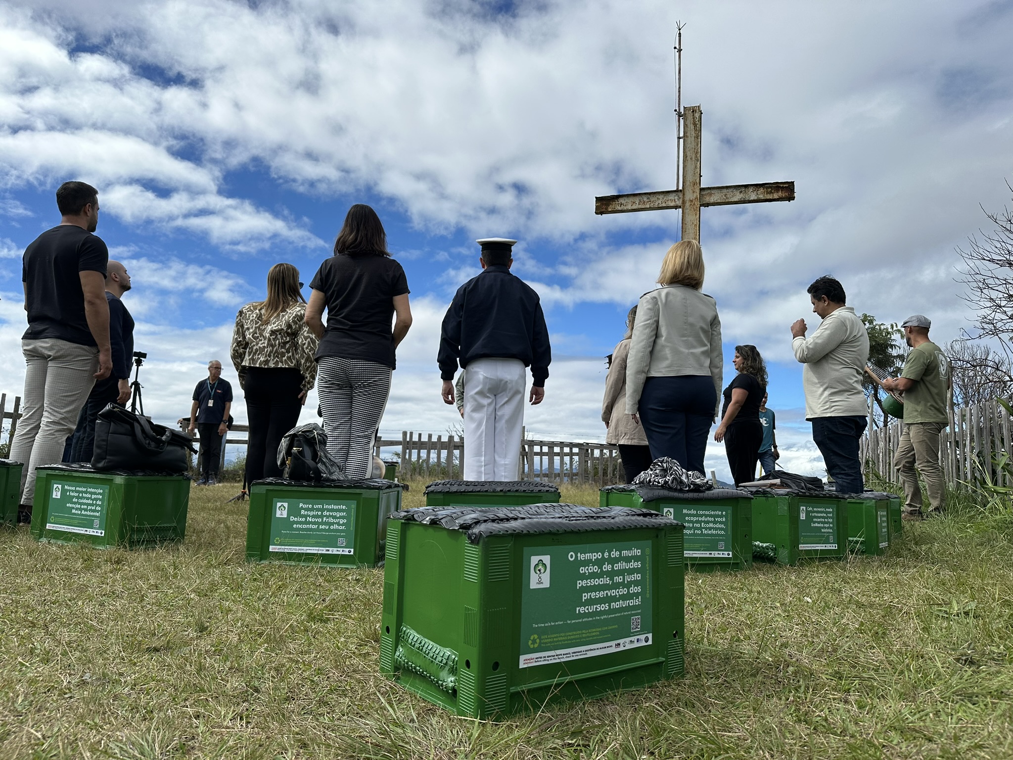 Esta instalação sustentável da EcoModas contou com o apoio da Hn Comunicação Visual, Ju Cheles, MFG Contabilidade, Convention Bureau de Nova Friburgo e Centro de Lazer do Teleférico, e foi oficialmente apresentada à cidade como "um presente para Nova Friburgo", antecedendo as comemorações do aniversário do município, celebrado em 16 de maio. No momento de inauguração, estiveram presentes alguns representantes do setor de turismo, meio ambiente, Marinha do Brasil, OAB-RJ, TV Cidade, TV Zoom, InovaFri Valley e outros. A manhã deste dia foi marcada também por uma experiência sensorial única, que convidou os participantes à contemplação não apenas da natureza, mas também de si mesmos. Envolvidos pelo som suave do handpan, conduzido por Ricardo Vasconcelos, da Medicina do Som, os presentes vivenciaram um momento de introspecção a 1.380 metros de altitude. A atividade contou ainda com a participação do professor de yoga Henrique Moraes, que guiou o grupo em práticas respiratórias leves, promovendo conexão, presença e bem-estar. Como gesto simbólico, uma muda de Quaresmeira foi plantada no Morro da Cruz pela secretária do Meio Ambiente, Andréa Duque, em conjunto com Adriana Santos, bióloga e sócia fundadora da EcoModas, reforçando o compromisso com o cuidado com a natureza.