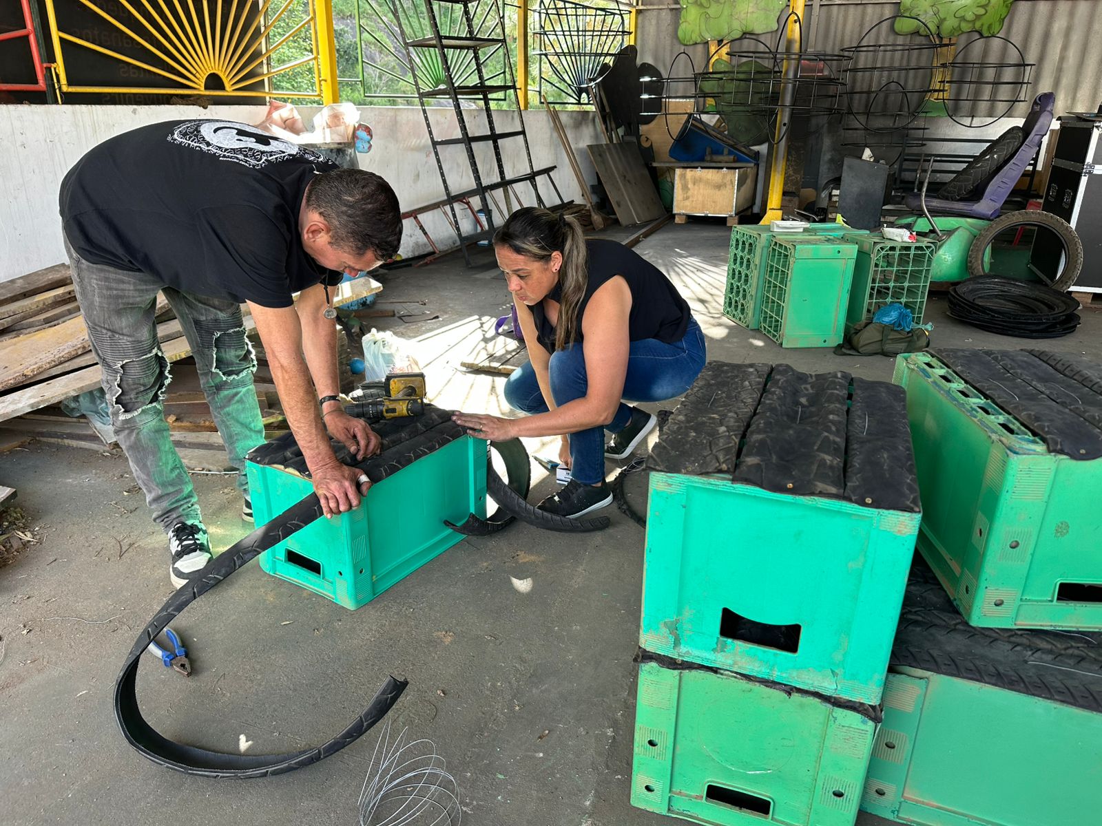 Feitas com reaproveitamento de garrafeiras plásticas e pneus, os bancos foram pensados para serem resistentes e confortáveis.