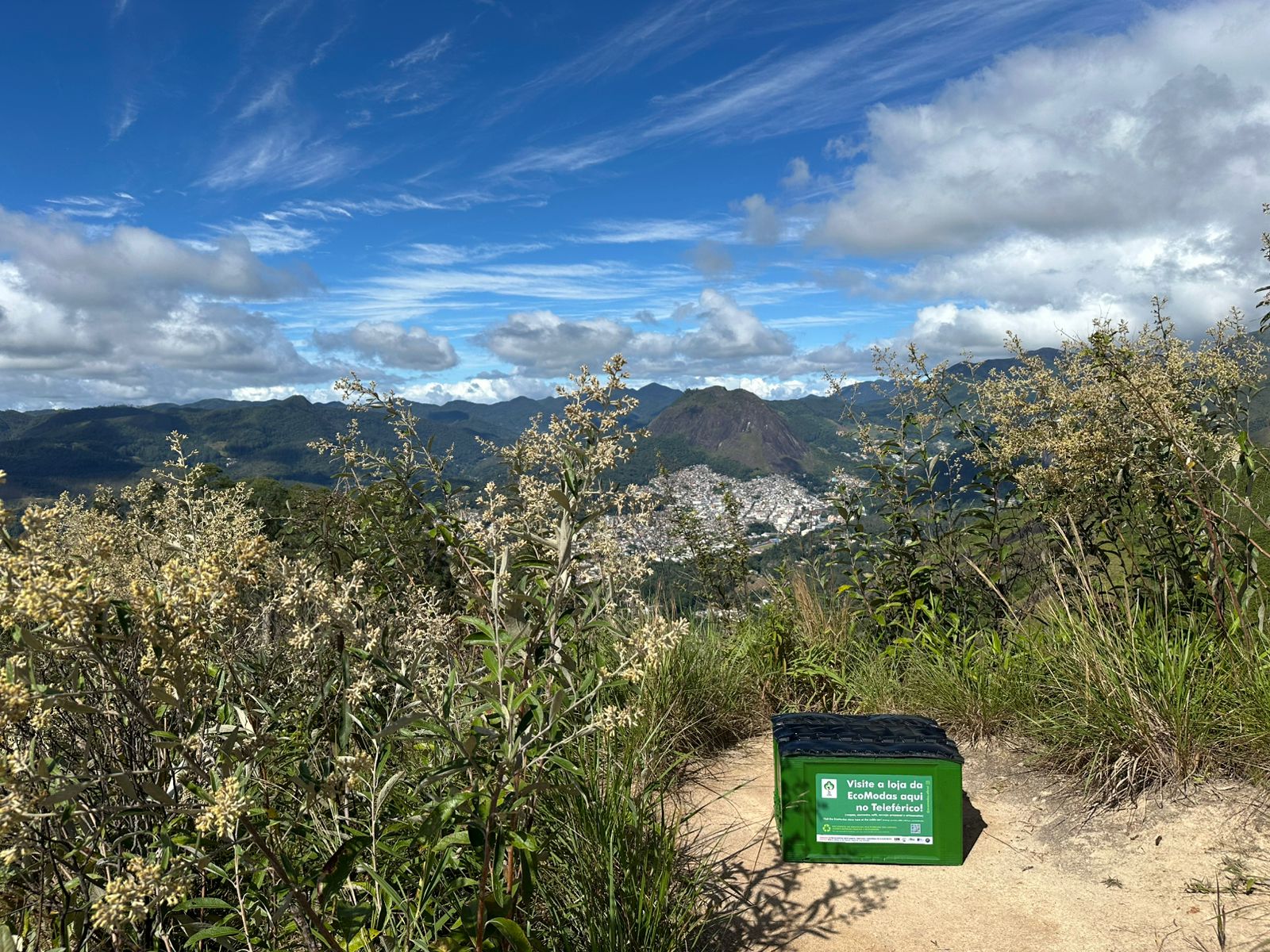 Os engradados plásticos ressignificados como bancos são os mesmos utilizados pela EcoModas em seu viveiro florestal, onde são cultivadas mudas de Palmeira-juçara em recipientes reaproveitados, como cones de linhas vazios descartados pela indústria da moda. A iniciativa reforça o compromisso da marca com a economia circular e a preservação ambiental. Até o momento, mais de 35 mil mudas já foram destinadas ao plantio em ações e projetos ambientais na região serrana do Rio de Janeiro. A EcoModas abriga também um meliponário de abelhas sem ferrão — essenciais para a polinização e o equilíbrio ecológico do morro do teleférico, área severamente afetada por uma queimada em setembro de 2024. A marca também implantou um coletor de garrafas plásticas de água mineral no primeiro estágio do teleférico, incentivando os turistas a descartarem corretamente esse tipo resíduo, que gera, em média, cerca de 500 unidades por mês. Todo o material plástico coletado é destinado a projetos sociais e empreendedores da cadeia da reciclagem. Entre outras iniciativas de destaque estão o Jardim da Reciclagem — com esculturas feitas a partir de materiais reutilizados — e a Trilha do Oxigênio, que proporciona aos visitantes um momento de conexão profunda com a natureza.