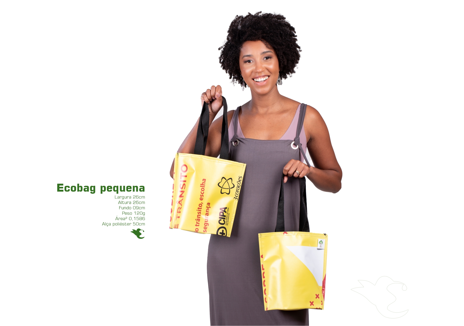 Banners e lonas que não têm mais uso em campanhas podem ganhar uma nova função por meio da confecção de produtos sustentáveis personalizados, como: